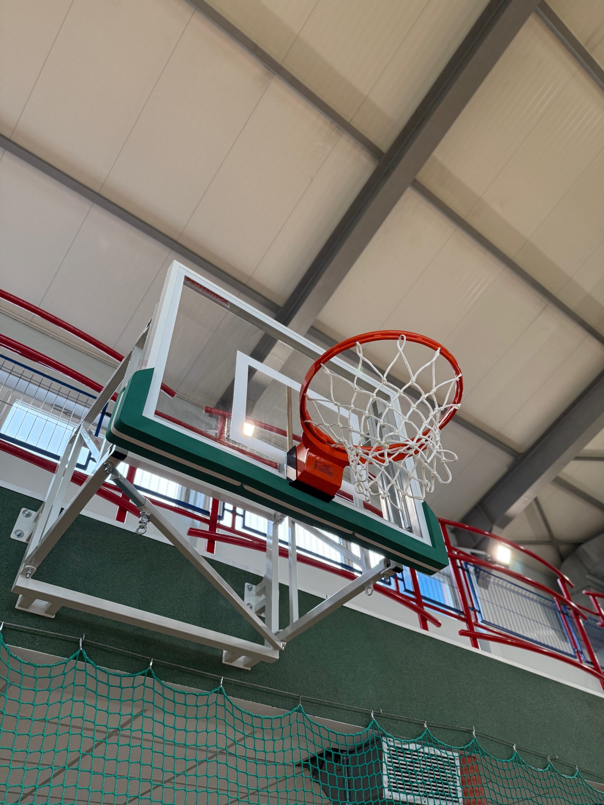 Kosze wyposażone są w konstrukcje uchylną z mechanizmem regulacji wysokości z tablicą treningową ze szkła akrylowego oraz z obręczą do koszykówki z siłownikiem gazowym.