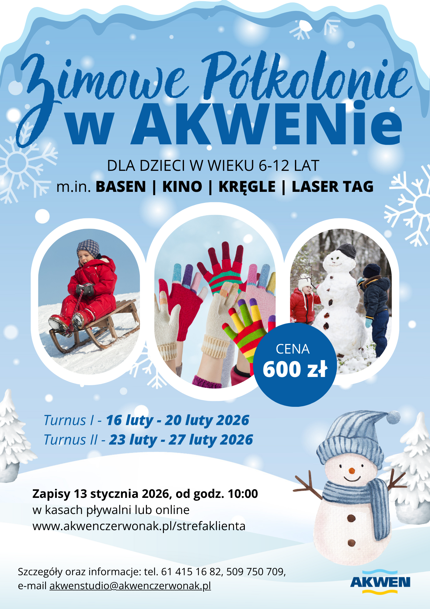 Zapraszamy dzieci w wieku 6 – 12 lat na ZIMOWE PÓŁKOLONIE Z AKWENem!